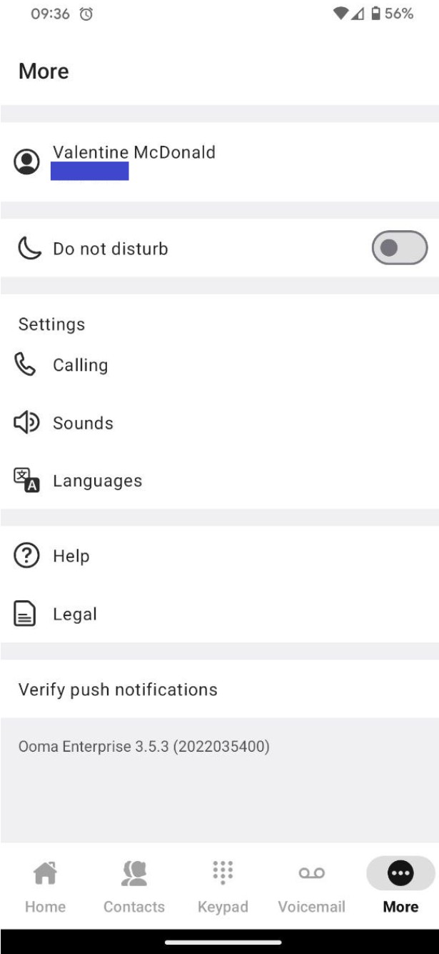 The More section serves as the Ooma Enterprise Mobile app’s Settings, allowing you to configure various aspects of the app and its modules. Let’s explore each section in detail.