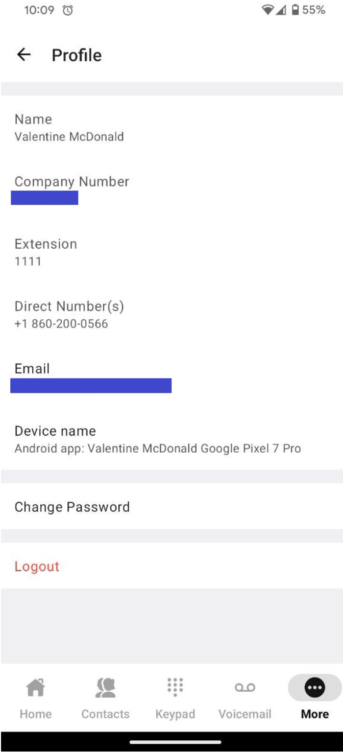 - Your Profile Section: here, you can find all the key details of your account, including your phone number, extension number, email, and the device on which the app is installed. This section also allows you to change your password or log out of the Ooma Enterprise Mobile app.