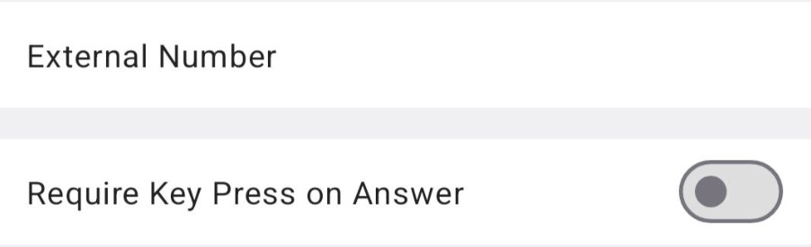 - Require Key Press on Answer: if disabled, calls will be forwarded directly to the external number without notifying the app user. If enabled, the app user will see the incoming call and must confirm forwarding by pressing a button.
