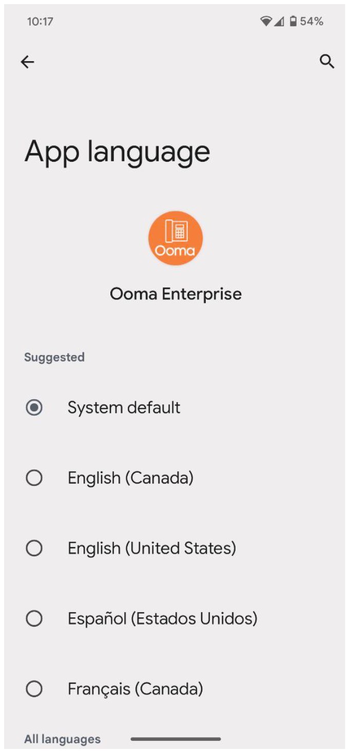 - Languages: here, you can choose one of your device’s supported languages to set as the Ooma Enterprise Mobile app’s main language.